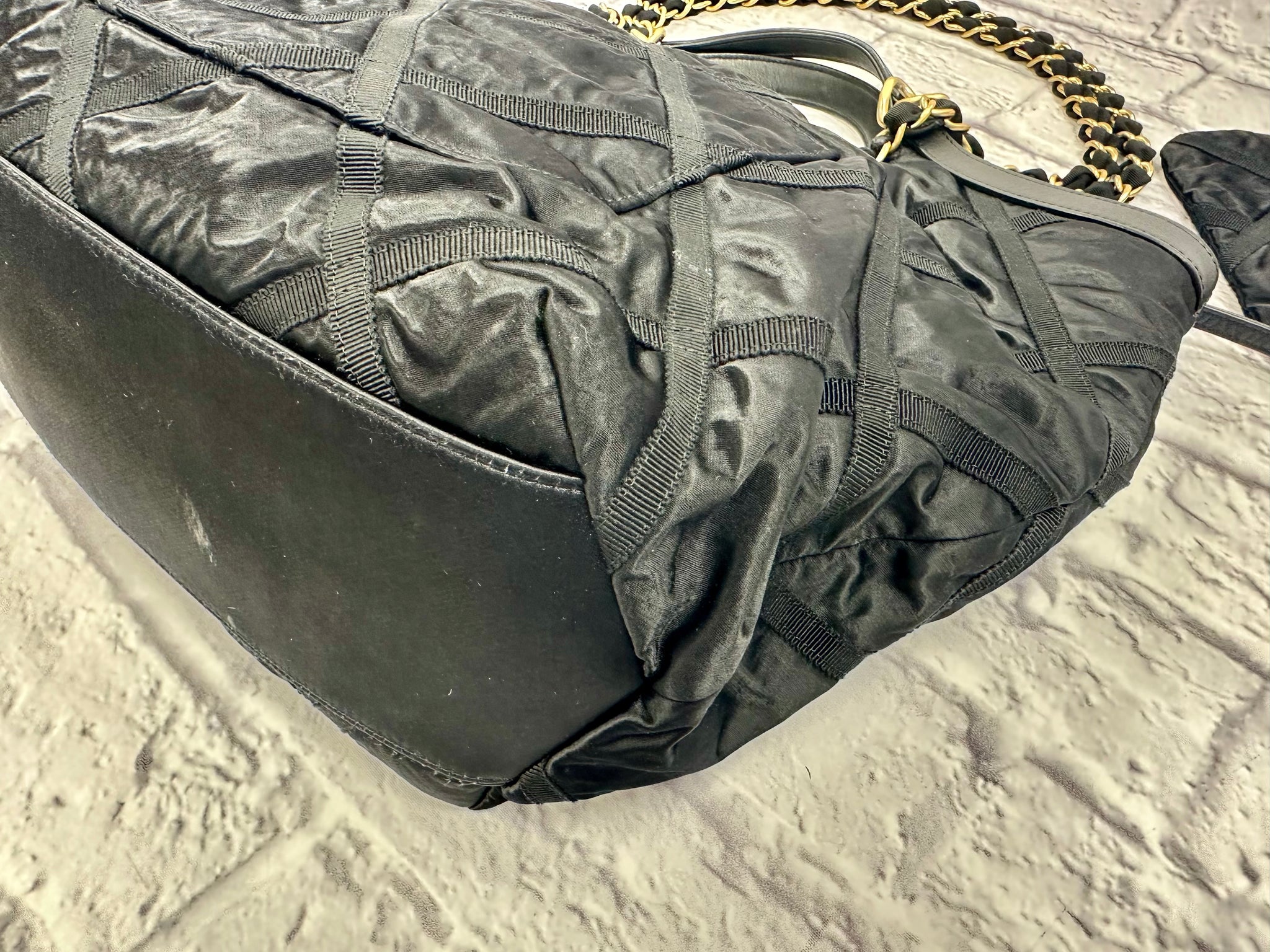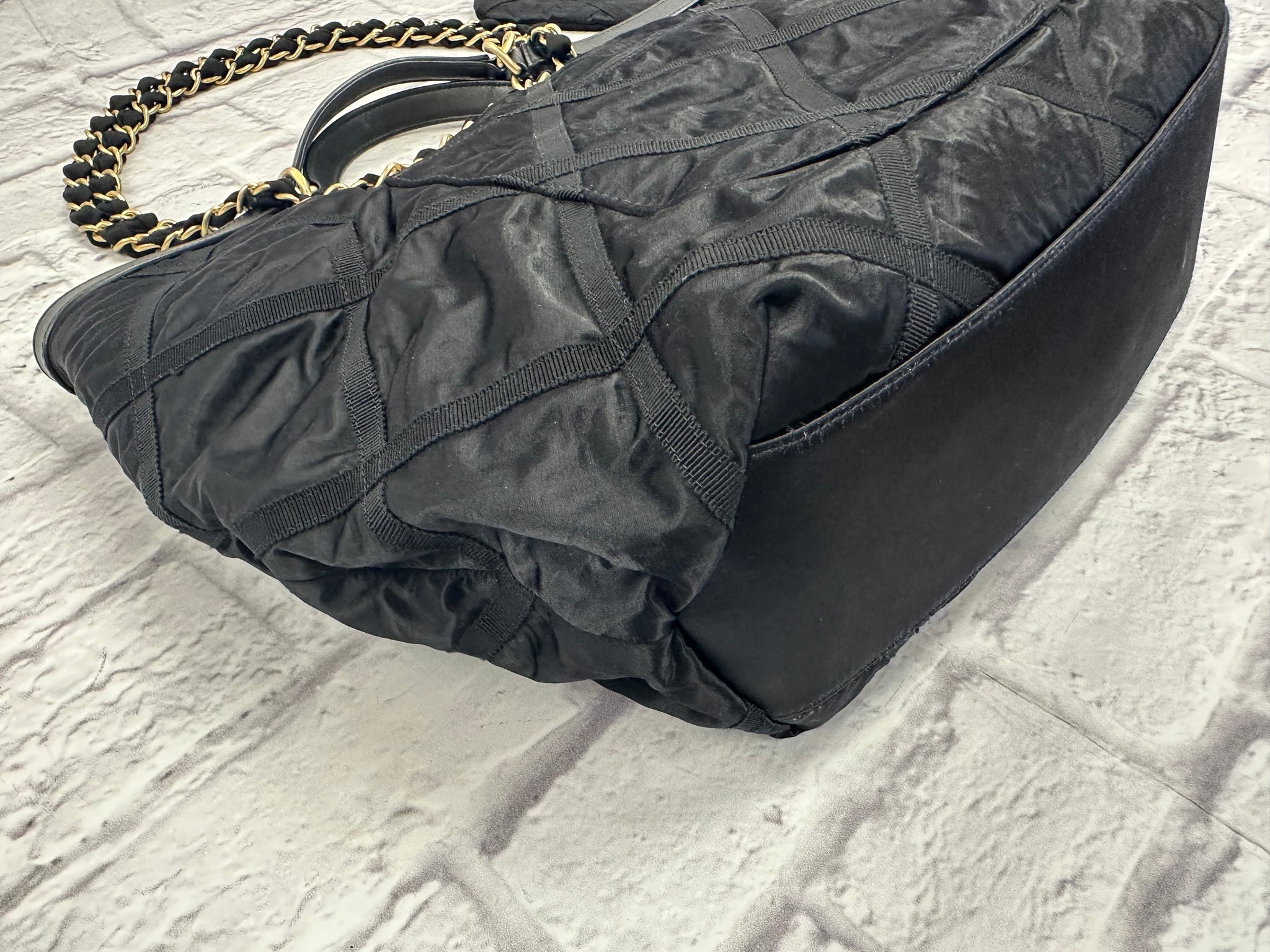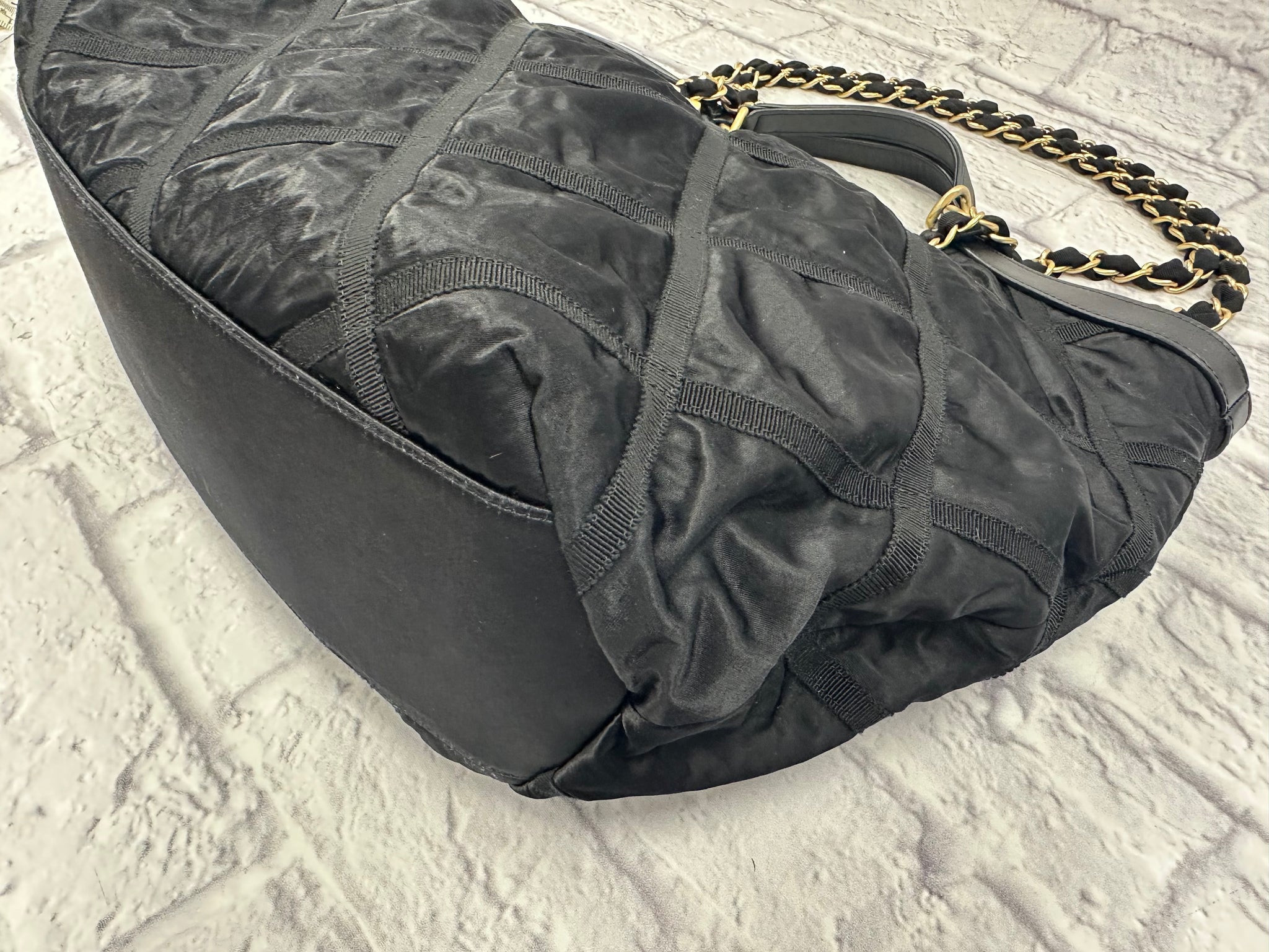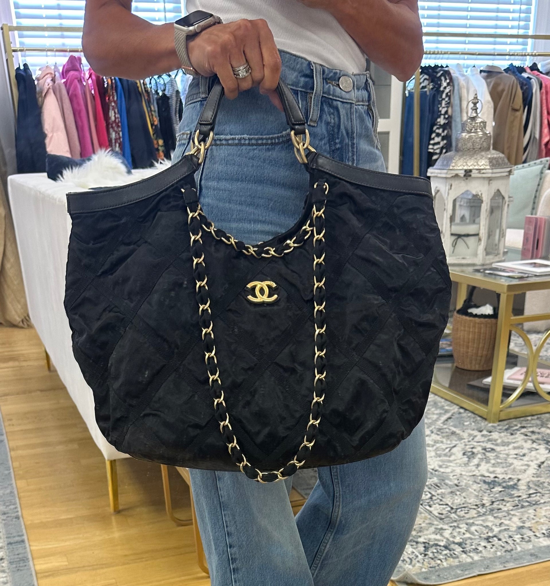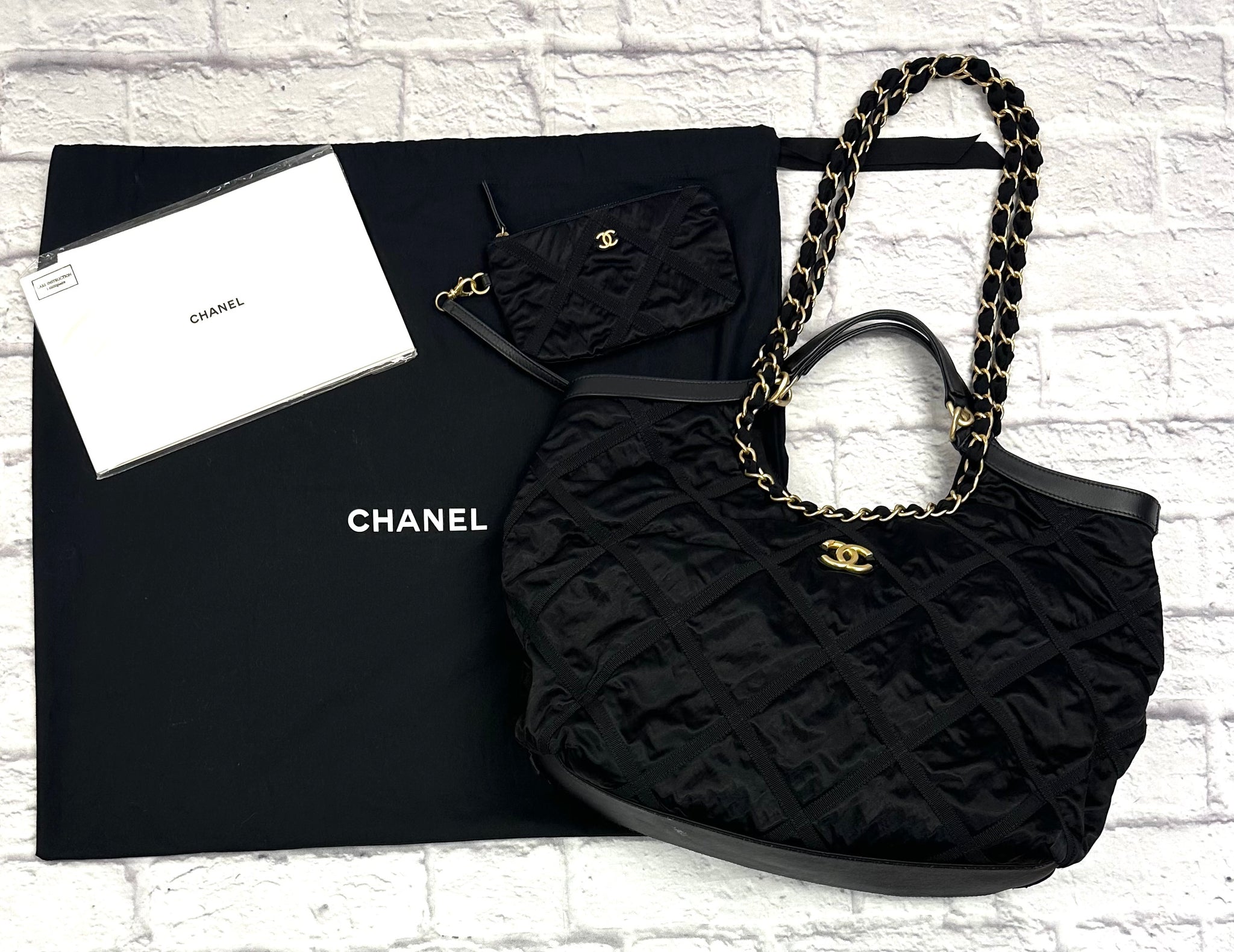 Chanel Black Nylon Quilted Maxi Shopping Tote, excellent condition. Features quilted black nylon with grosgrain stitching. Can be worn top handle or on the shoulder. Aged gold-tone hardware. Magnetic snap closure opens to a clean fabric interior with two patch pockets and one zip pocket, features one exterior patch pocket. Comes with detachable matching pouch. Measures approximately 15”L x 14”H x 4”D, 6.5” top handle drop, 14.5” shoulder strap drop. Comes with original tag, booklet and dust bag.