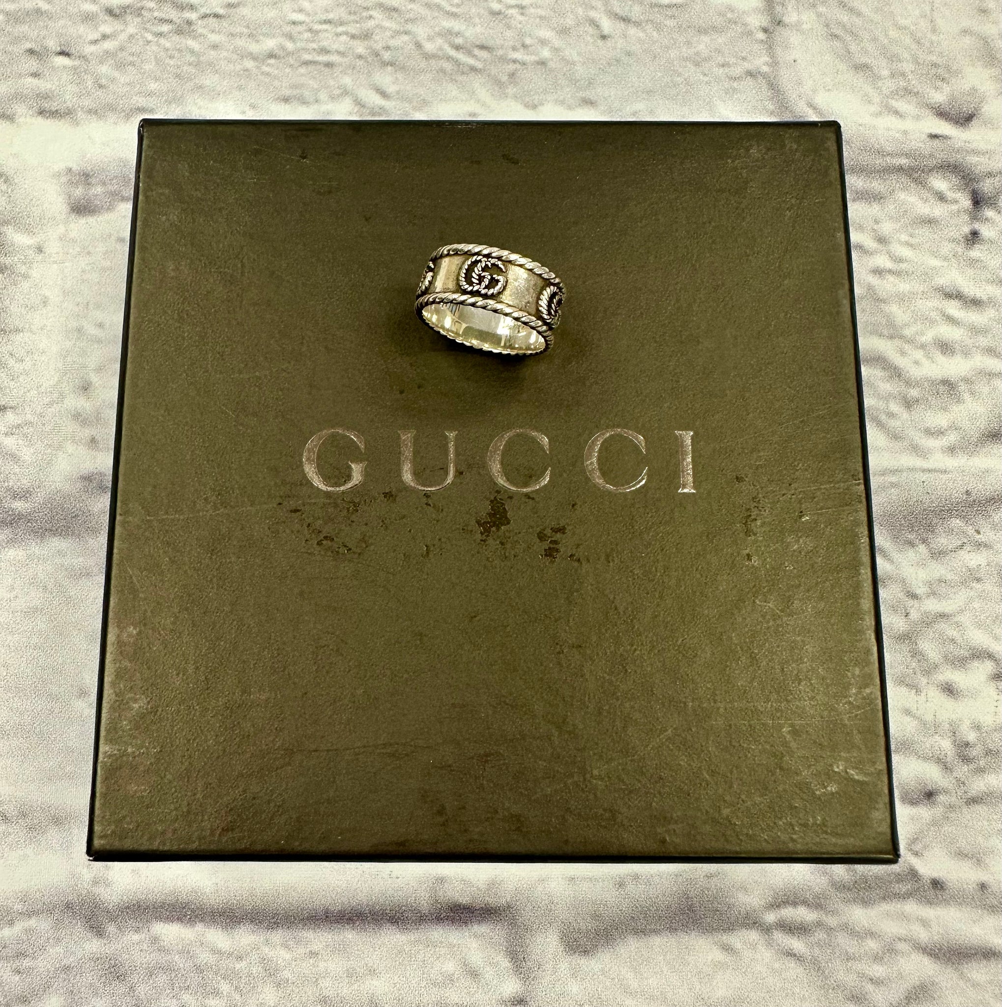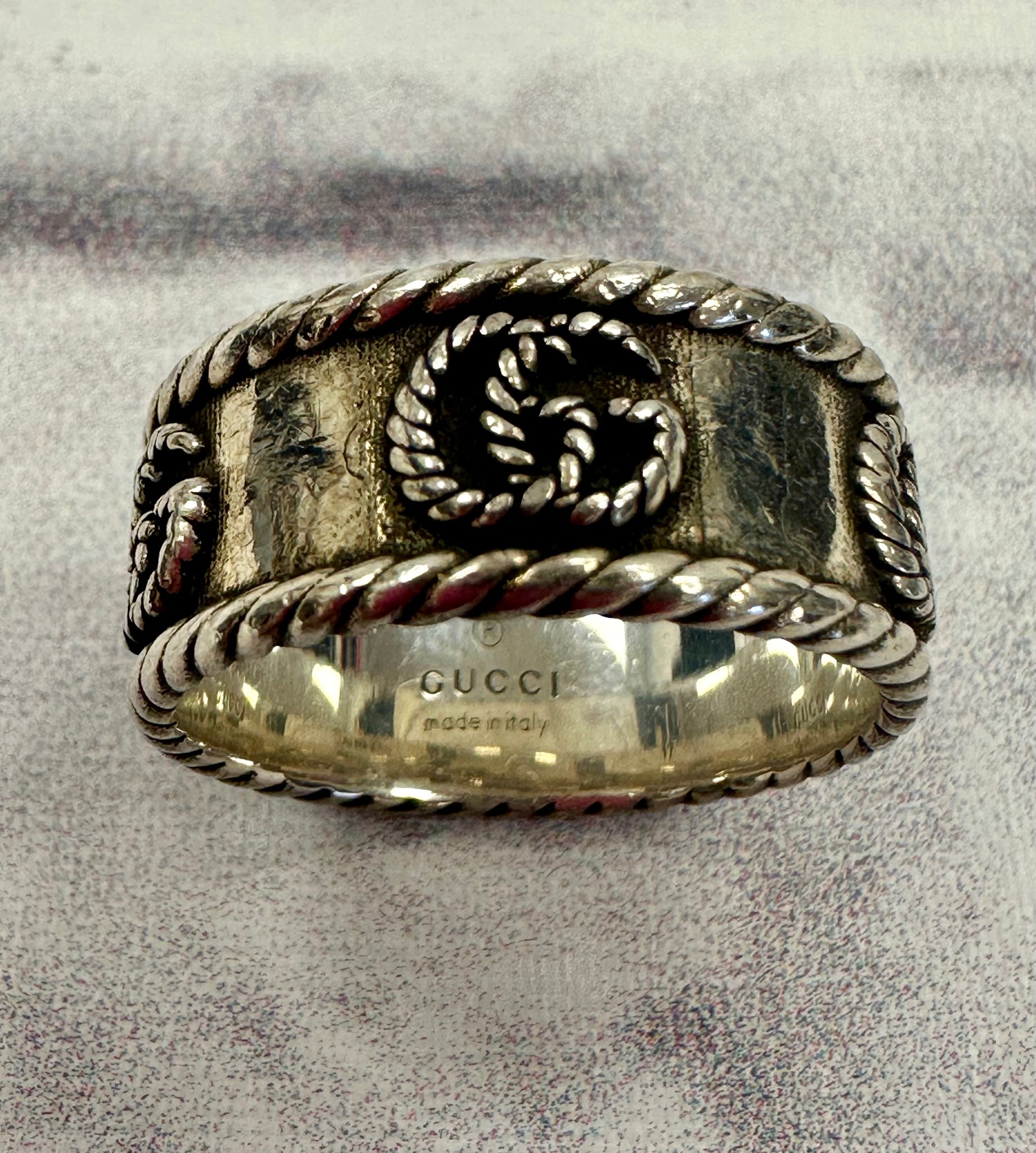 Gucci Sterling Silver Ring SZ 8. Features aged sterling silver with double G detail. Comes with Gucci jewelry box.