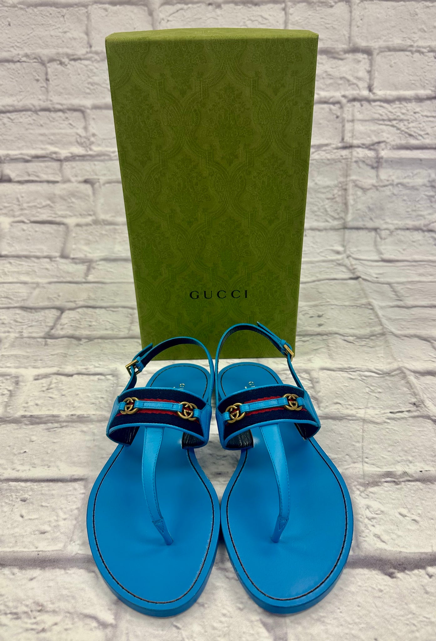 Gucci Interlocking G Web Sandal SZ 37.5, NEW with box. Gold-tone hardware, green and red web detail, leather sole and adjustable buckle closure.