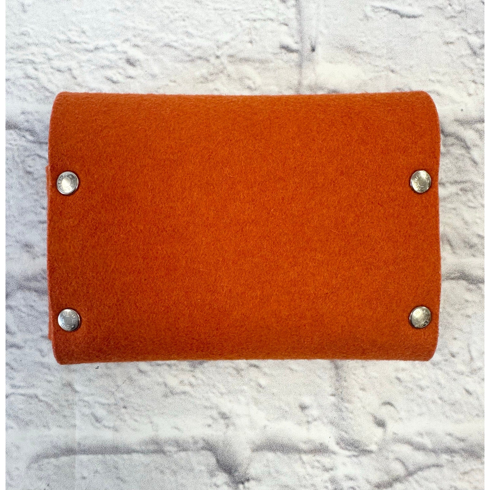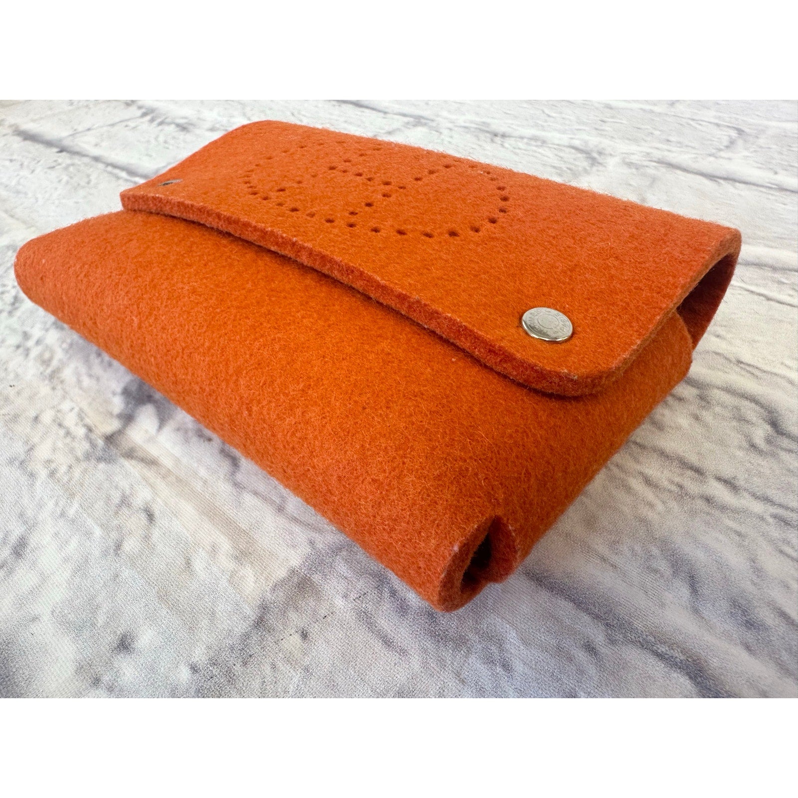 Hermes Orange Felt Mises Et Relances Playing Card Holder, excellent condition. Features vibrant orange felt with a perforated “H” on front flap and two snap closure. This can be used as intended or as a small clutch or wallet. Measures approximately 5.75”L x 4”H x 1.5”D. Comes with original dust bag and certificate of authenticity.