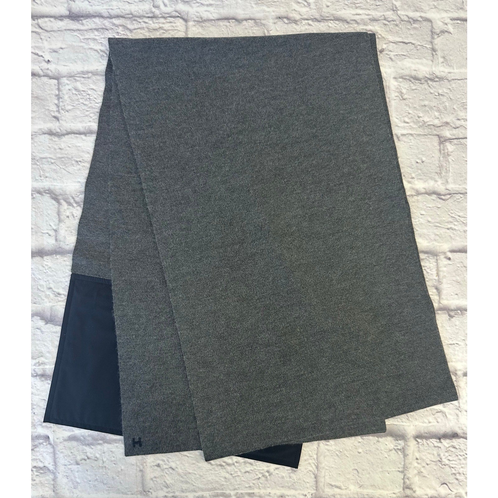 Hermes Silk & Cashmere Grey Scarf, NEW. Features 70% cashmere & 30% silk with a zippered nylon pocket. Comes with original box and ribbon.