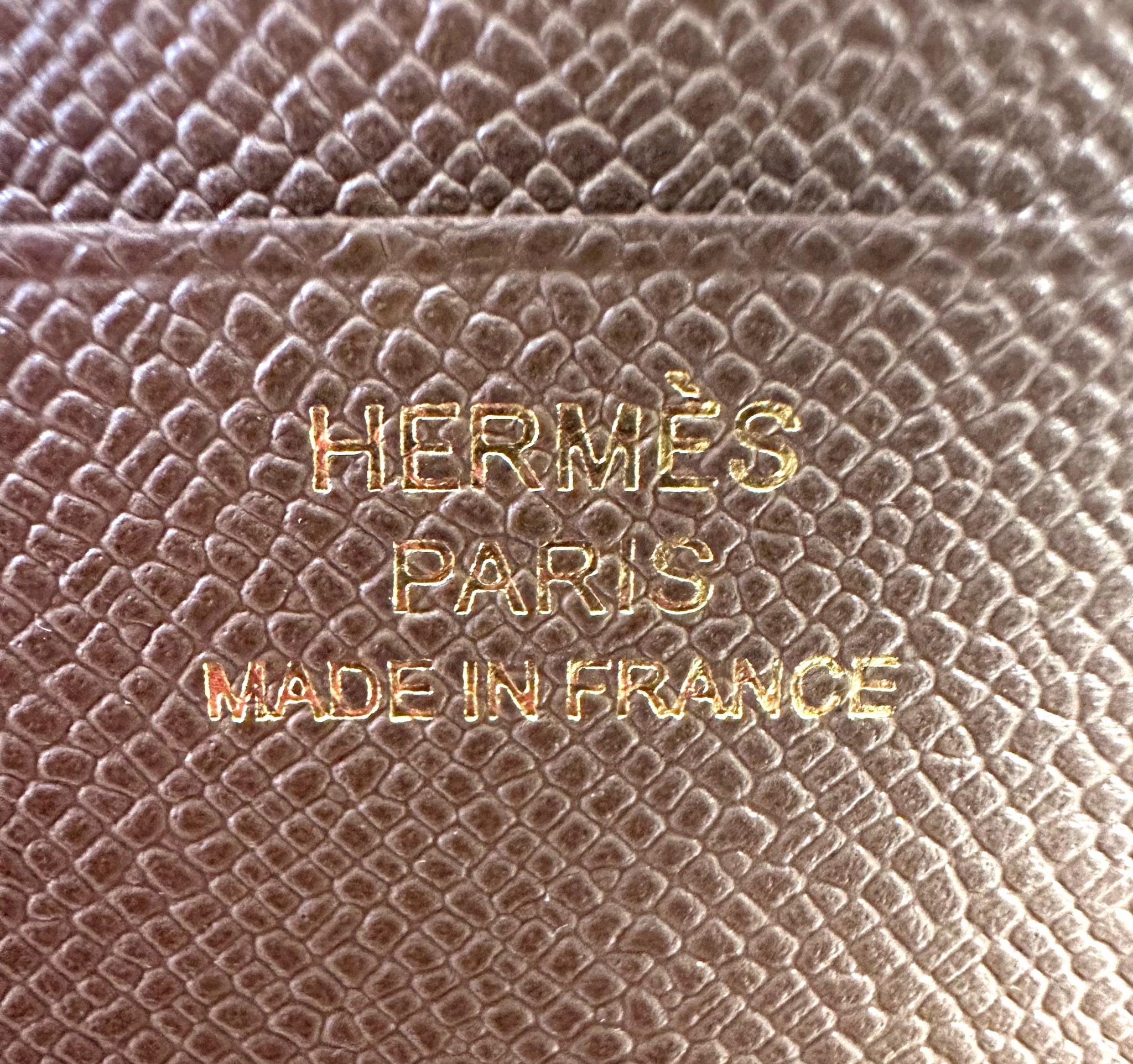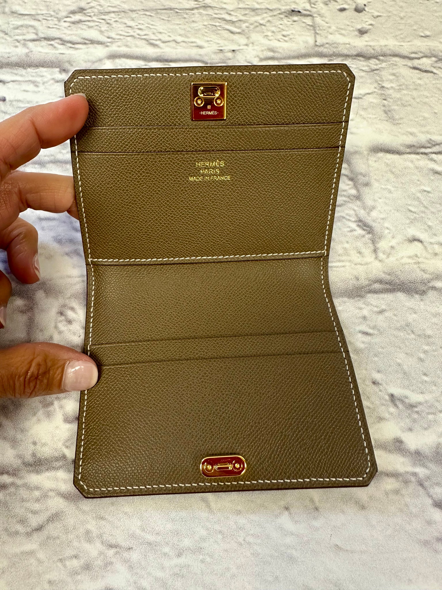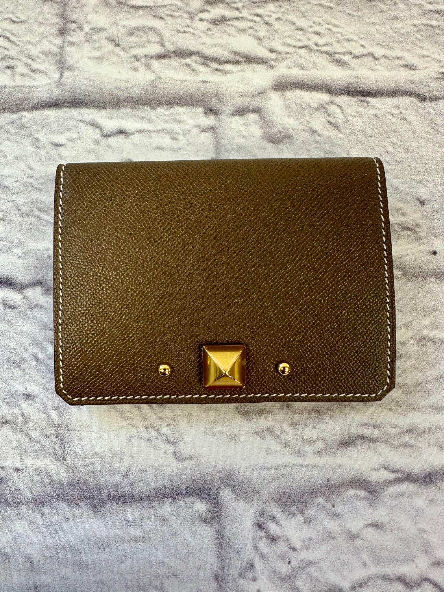 Hermes Medor Etoupe Gray Studded Card Holder, New. Four card slots, shiny yellow gold plated hardware and Clou Medor closure still sealed. Measures approximately 4”L x 3”H x 1”D. Comes with original box.